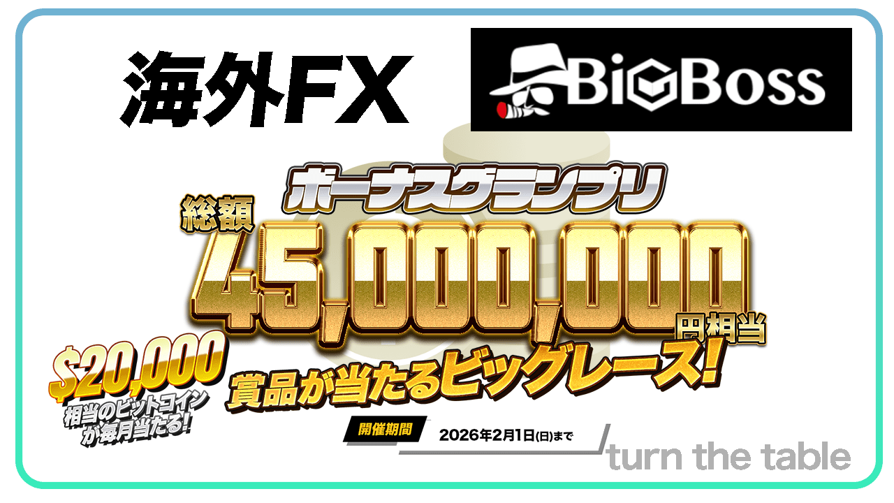 | \ハイレバ 2222倍/ BigBoss | 15,000円 ➡ ボーナスGET | 初回入金 100%ボーナス | $700 (約10万円) | 2222倍 ※デラックス口座 | あり | 口座開設 |