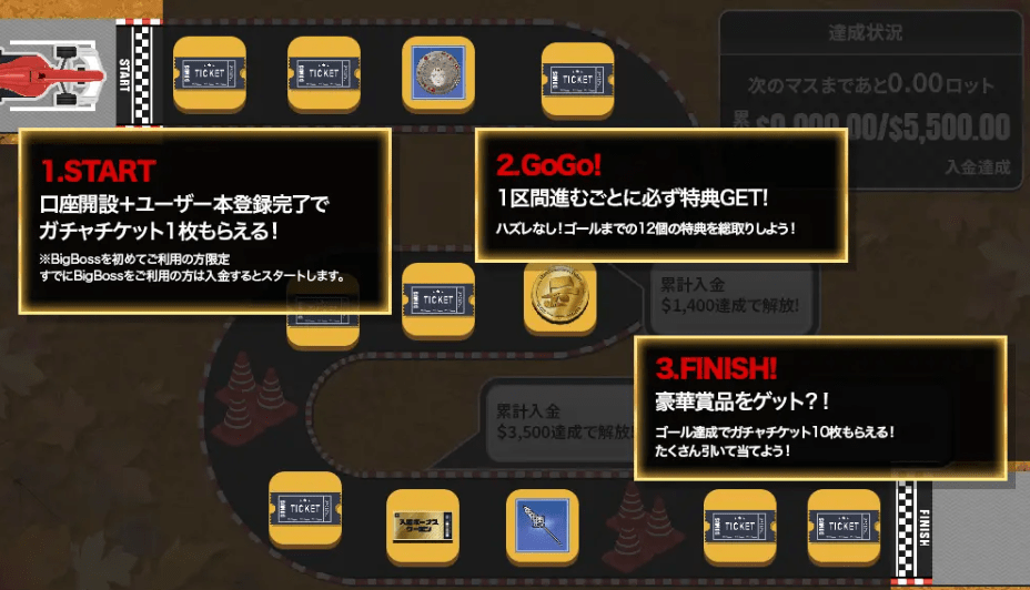 5ロットの取引ごとにマシンが1区間進み、12区間進むとゴールとなります。ゴールまでの間に、累計入金額に応じて突破できる「障害物」が3か所あります。障害物で進行が止まっていても、取引ロット数はカウントされます。後から入金すると、その間に貯まったロット分もまとめて反映されます。ゴールした後も、特典を獲得できるレースをご用意しています。なお、ゴール後は1区間進むのに必要なロット数が6ロットとなります。
