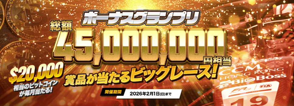 そんなBigBossが総額45,000,000円相当の賞金が当たるビッグレースを開催中!今回はそのボーナスグランプリの内容をご紹介。この機会を見逃さずに是非参加してみましょう。