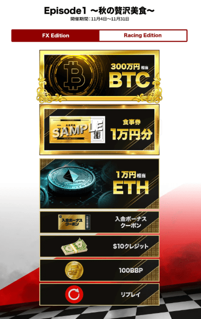 2026年2月1日(日)まで開催されるグランプリで、取引量に応じてマシンが進む仕組みとなっています。5ロットの取引ごとにマシンが1区間進み、12区間でゴールするシンプルなルールです。